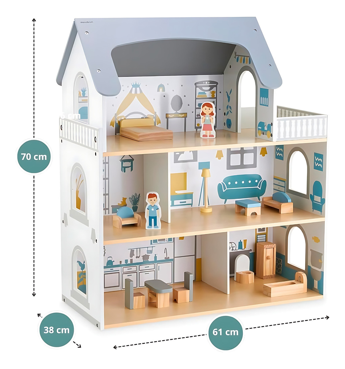 ¡El regalo perfecto para estimular la imaginación de los niños! Esta hermosa casa de muñecas de madera de 3 pisos con terraza es el escenario ideal para horas de juego y creatividad.