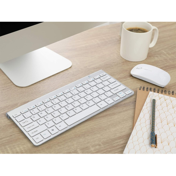 Nuestro set incluye un teclado ultra delgado y un mouse ligero, diseñados para ofrecer portabilidad y comodidad. Gracias a su tecnología inalámbrica USB 2.4G y Bluetooth, es compatible con Apple Mac, iOS, Samsung, Android y Microsoft Windows PC y portátiles. Disfruta de un escritorio ordenado sin cables y mejora tu experiencia de uso con teclas táctiles ligeras y una suave interacción en cada pulsación.
